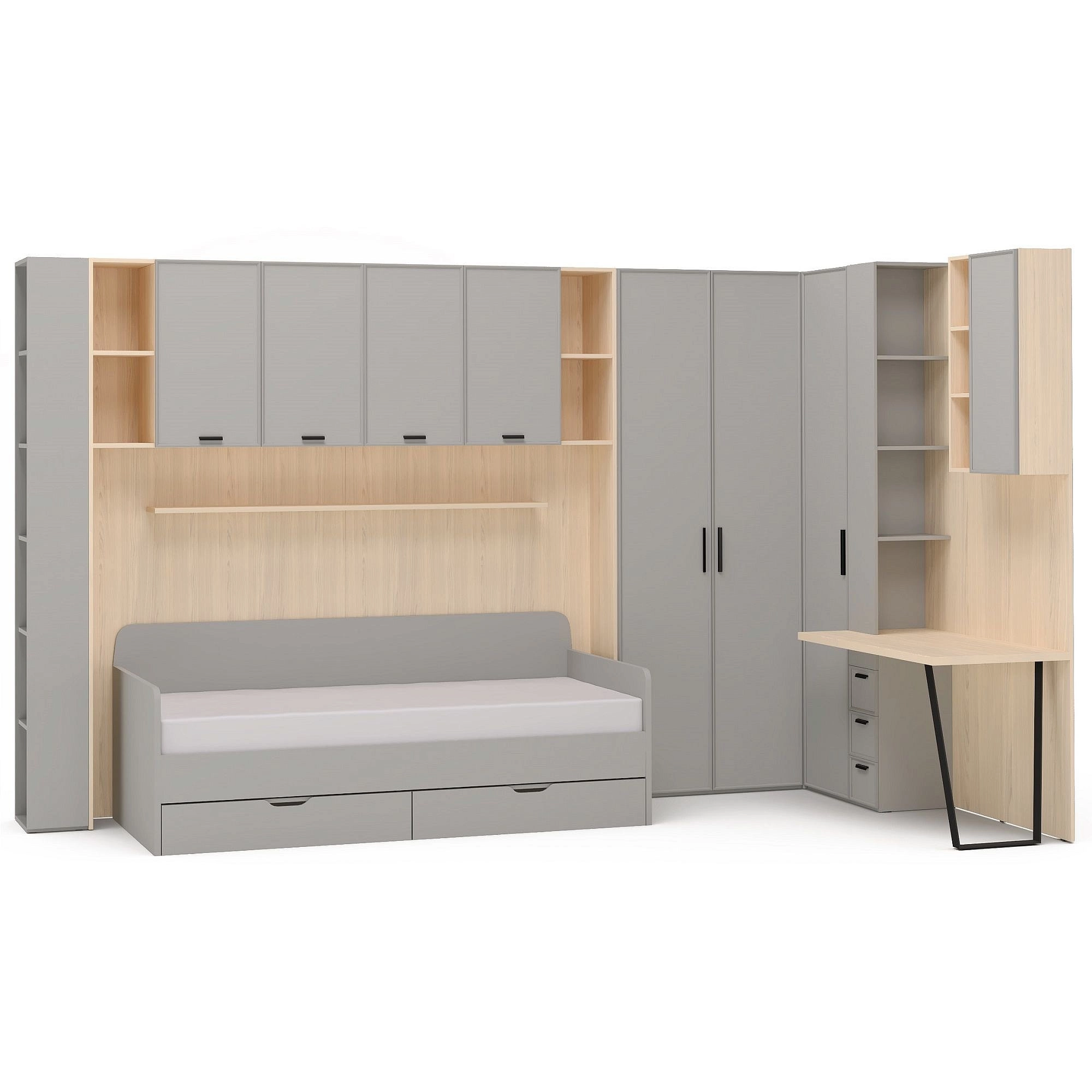 - секция с письменным столом позволит с удобством погрузиться в учебный процесс. На широкой столешнице можно разместить ноутбук или монитор ПК, под столешницей три ящика для хранения письменных принадлежностей и личных вещей. В комплектацию стола входит заглушка для кабель-канала, чтобы убрать с рабочей зоны мешающие провода. Дополнительно можно приобрести встраиваемую в столешницу USB-розетку для зарядки ваших любимых гаджетов. Правый край стола опирается на металлическую опору. Благодаря ее тонким стильным линиям стол не выглядит громоздким. Слева открытые боковые полки стеллажа для быстрого доступа к самому необходимому, например, книгам и канцелярии, а также для декора. Сверху над рабочей зоной - вместительные отсеки за глухим фасадом. Для удобства дверь верхней секции оснащена механизмом PUSH open, который откроет дверцу простым нажатием;