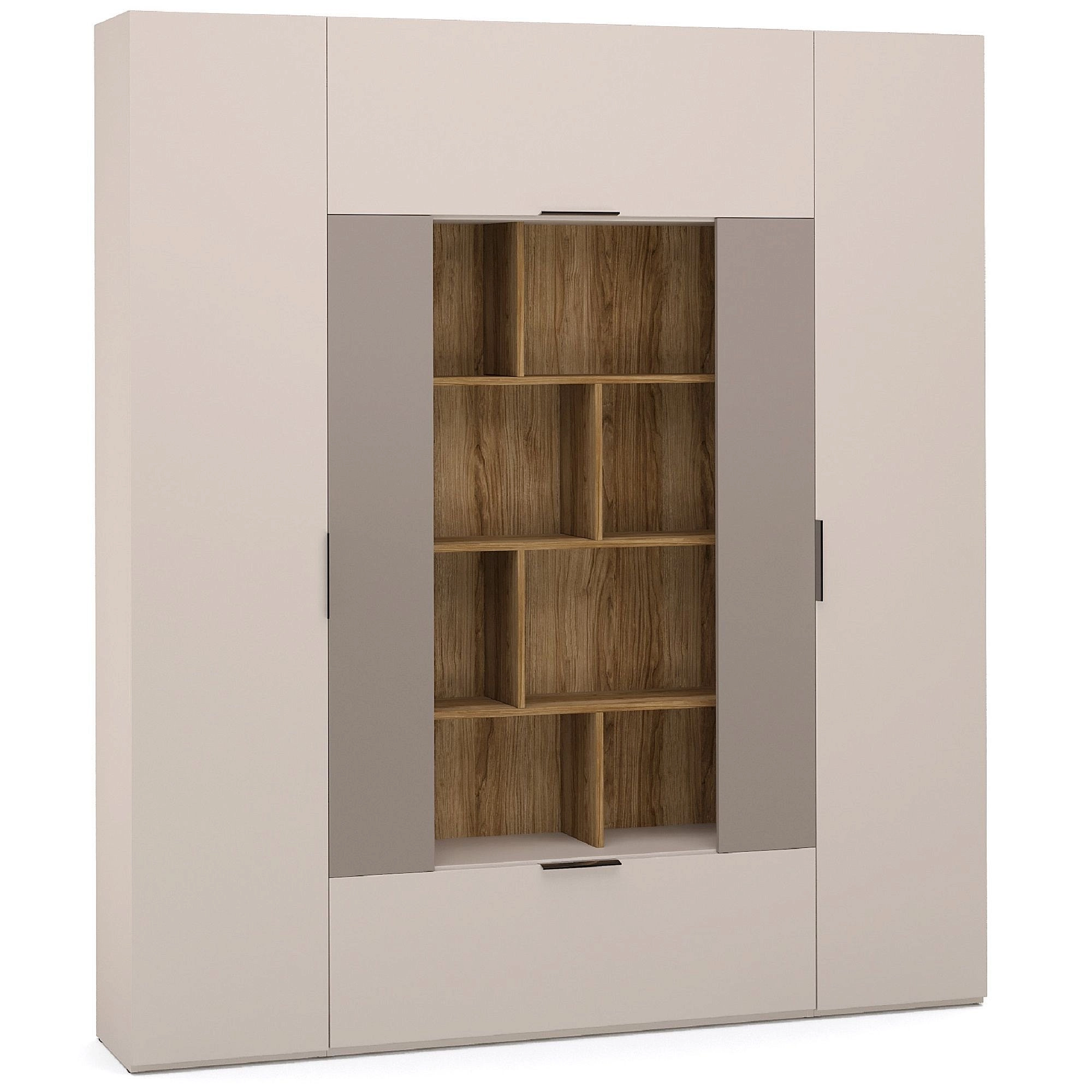 - секция с полками подходит для хранения книг, любимых и памятных вещей, различных редких сувениров и наград. Дополнительная подсветка секции придаст интерьеру особый шарм. Внутренний объем за откидной дверью разделен вертикальной перегородкой на два отделения – это поможет упорядочить размещение вещей. За фасадом ящик имеет также деление на две части для вашего удобства;