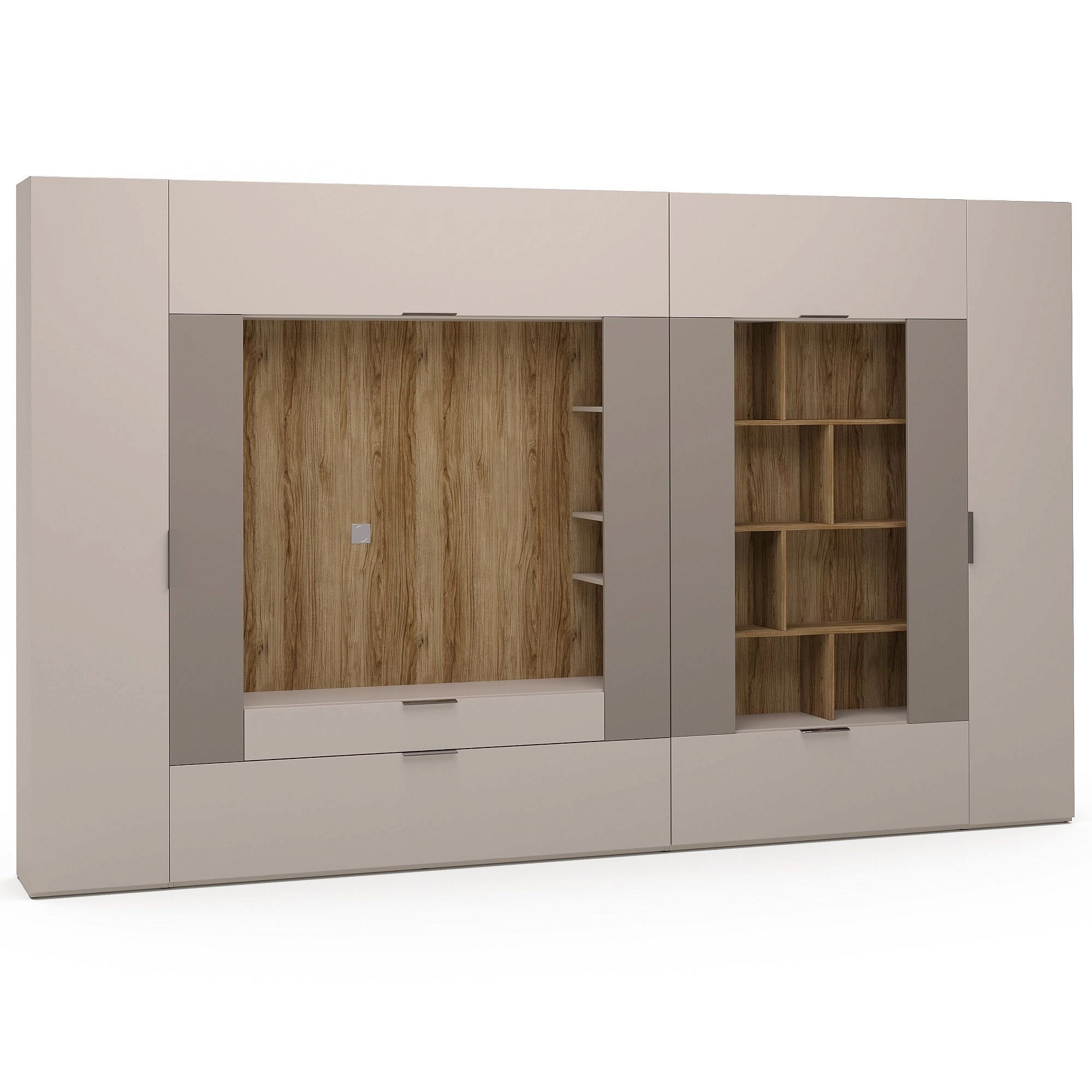 - секция ТВА. Внутренний объем за откидной дверью разделен вертикальной перегородкой на два отделения – это поможет упорядочить размещение вещей. Все провода можно пропустить через специальное отверстие в задней стенке. За каждым фасадом ящики имеют деление на две части для вашего удобства. Дополнительная подсветка секции придаст интерьеру особый шарм. Размер зоны ТВА - длина 1277мм, высота 1299мм;
