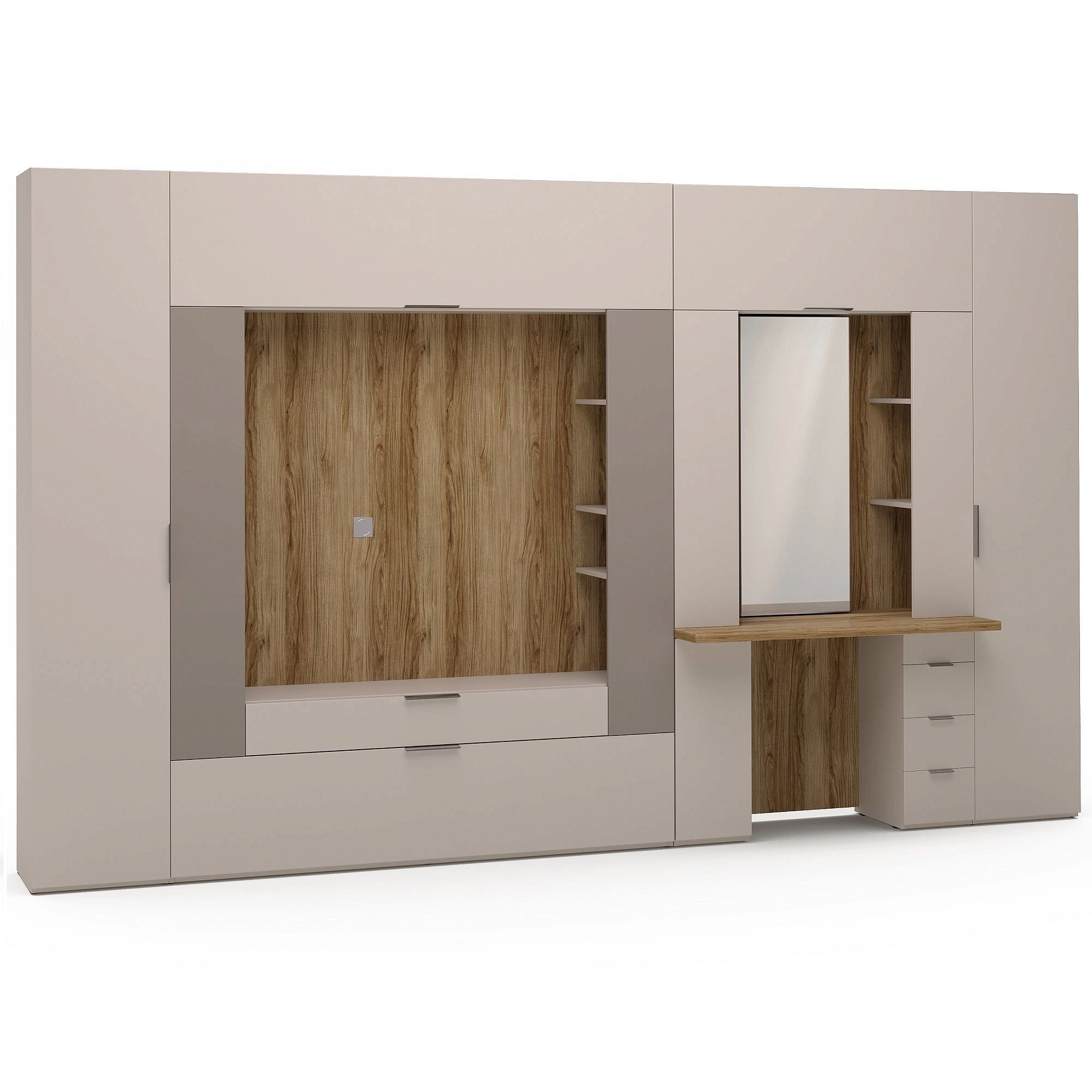 - секция с туалетным столом. В этой секции найдется место и для косметики, и для канцелярских принадлежностей и ноутбука. На широкой столешнице можно разместить ноутбук или монитор ПК, под столешницей три ящика и отсек с полками за глухим фасадом для хранения письменных принадлежностей и личных вещей. В комплектацию стола входит заглушка для кабель-канала, чтобы убрать с рабочей зоны мешающие провода. Дополнительно можно приобрести встраиваемую в столешницу USB-розетку для зарядки ваших любимых гаджетов. За боковыми распашными фасадами - открытые полки стеллажей для быстрого доступа к самому необходимому, например, книгам и канцелярии, а также для декора. Можно приобрести дополнительно подсветку для открытых полок стеллажей. Зеркальное полотно скрывает небольшие полочки, которые обеспечат достаточно места для хранения украшений и косметики. Сверху над рабочей зоной - вместительные отсеки за глухим откидным фасадом. Для удобства нижняя дверь оснащена механизмом PUSH open, который откроет дверцу простым нажатием.
