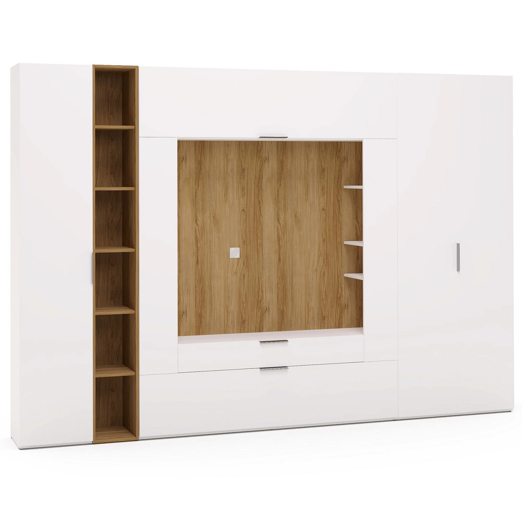 - секция ТВА. Внутренний объем за откидной дверью разделен вертикальной перегородкой на два отделения – это поможет упорядочить размещение вещей. Все провода можно пропустить через специальное отверстие в задней стенке. За каждым фасадом ящики имеют деление на две части для вашего удобства. Дополнительная подсветка секции придаст интерьеру особый шарм. Размер зоны ТВА - длина 1277мм, высота 1299мм;