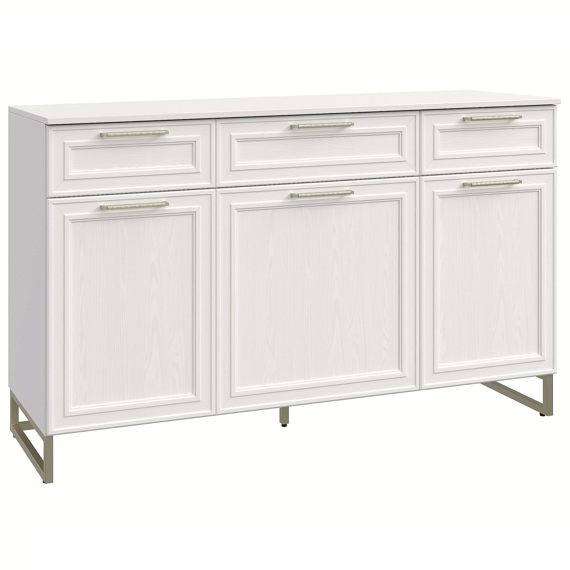 Белоснежное структурированное покрытие фасадов станет самодостаточным цветом для формирования дизайна пространства и незаменимой базой для смелых экспериментов с яркими деталями интерьера. Особую изысканность очертаниям модуля придает отделка декоративным рамочным профилем из МДФ, а также утонченные ручки благородного цвета Golden Shadow. Ручки имеют оптимальный размер и надежное крепление, а благодаря рифленой поверхности на них незаметны отпечатки пальцев.