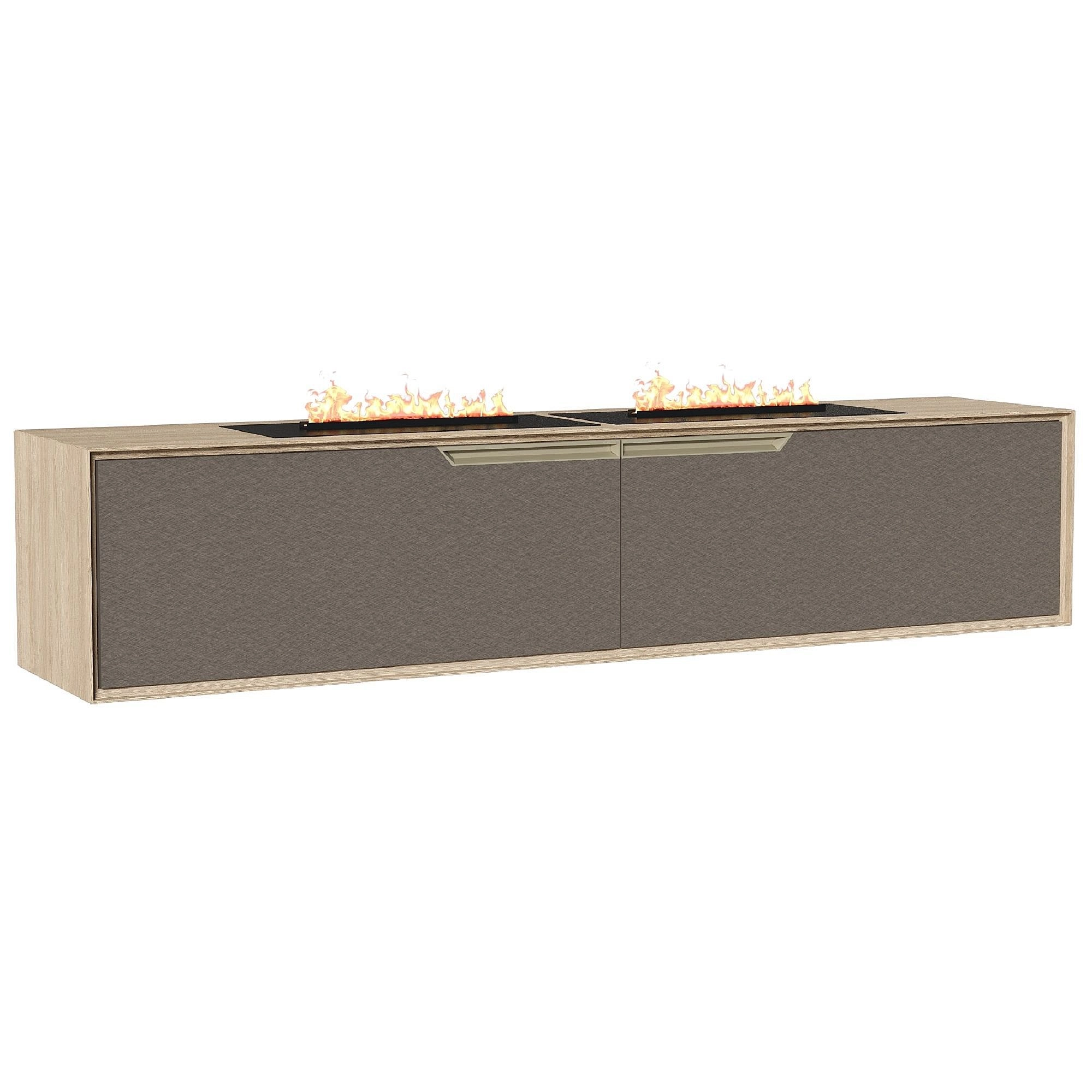 Подвесная тумба имеет два откидных фасада и два встроенных камина. У модели двойной корпус, внешняя часть выполнена из структурированной профилированной панели в темном и светлом древесном декоре. Фасады выполнены из надежной плиты в модном серо-бежевом оттенке с приятной матовой текстурой. Выраженный древесный рисунок полок подчеркивается рельефной задней стенкой в декоре «Мозаика». Ручки и опора в цвете «Шампань» создают удивительный мерцающий цвет за счет микроотражений.