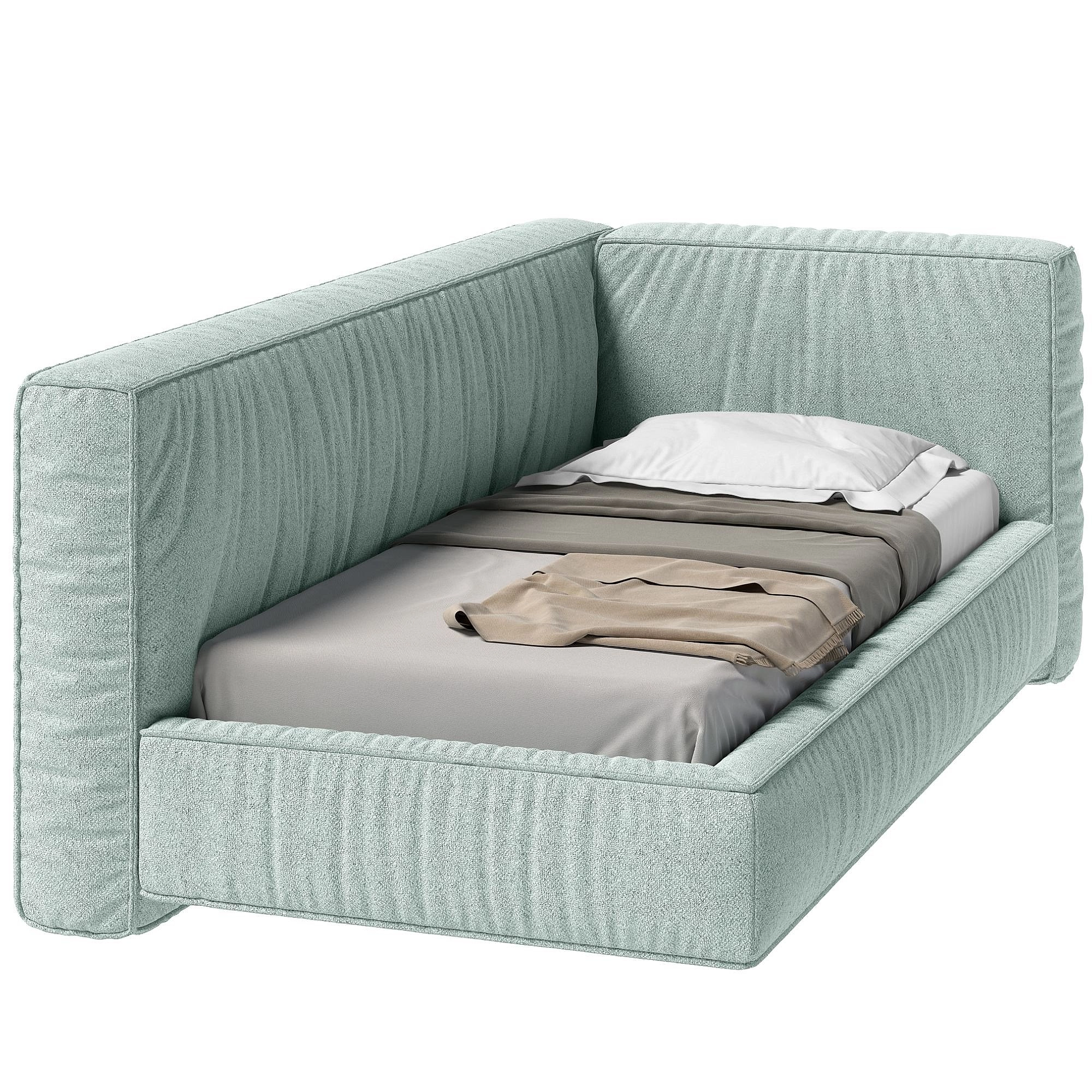 Конструкция с мягкими объемными бортами легко интегрируется в угловую часть небольшого пространства, задействуя всю полезную площадь. А разместив кровать в центре большой комнаты, вы сделайте ее настоящим арт-объектом в яркой и необычной интерьерной композиции. Мягкие объемные изголовья и борта с декоративными складками создают ощущение погружения в мягкость, расслабляя после тяжелого дня. Ортопедическое основание на металлическом каркасе с ламелями из натурального дерева обеспечит надежную поддержку для качественного и здорового сна. А уборка будет простой и быстрой – царги находятся на высоте 15 см от пола.