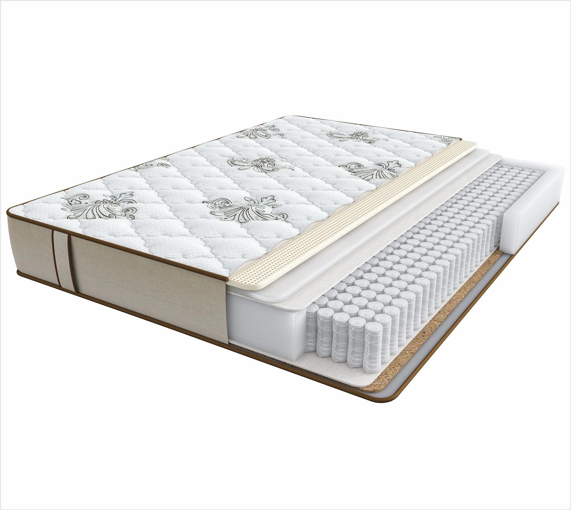 Нижняя сторона выполнена из двойного слоя кокосового полотна - 2 см , двойного слоя высокоэластичной пены Ortho Foam - 2 см, льняного полотна