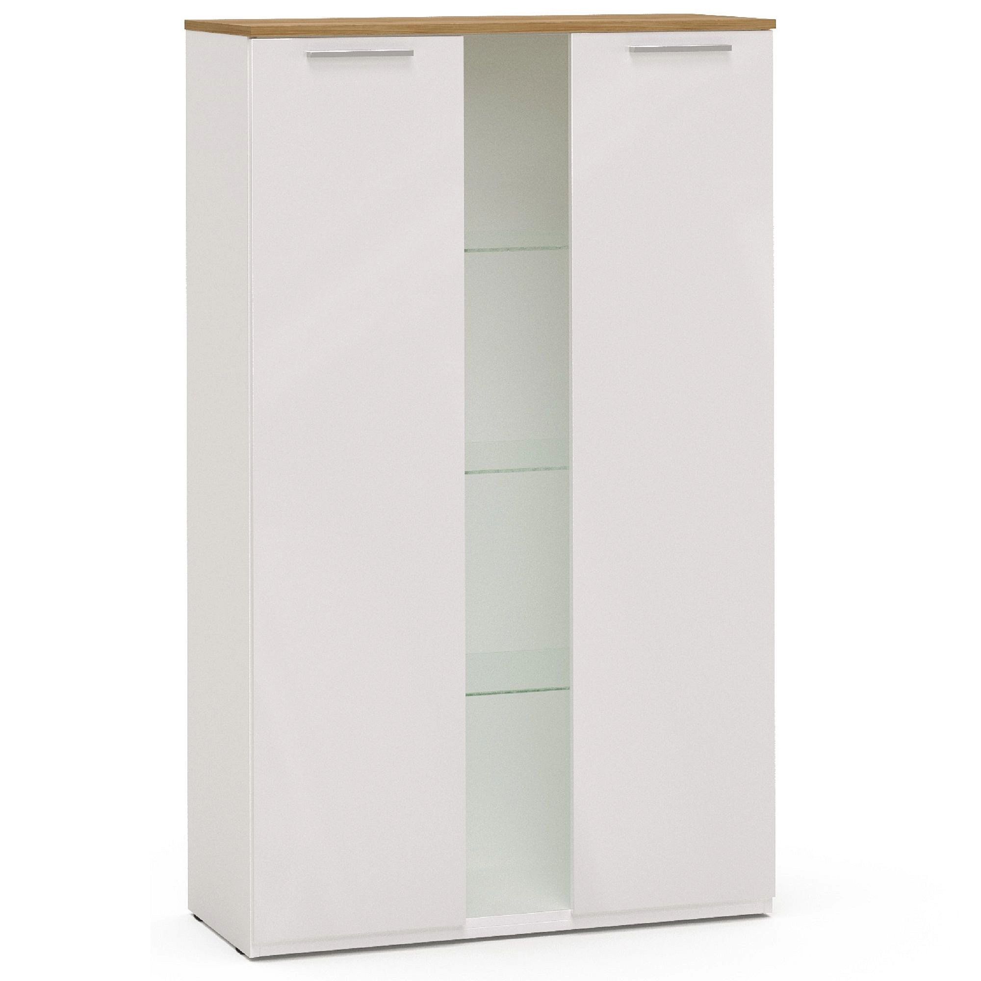 Описание: Шкаф-витрина с тремя стеклянными полками и двумя распашными фасадами подходит для хранения красивой праздничной посуды, любимых и памятных вещей, различных редких сувениров, наград. Белые фасады шкафа с высокоглянцевым лаковым покрытием создают ощущение легкости и света, визуально увеличивая пространство комнаты.