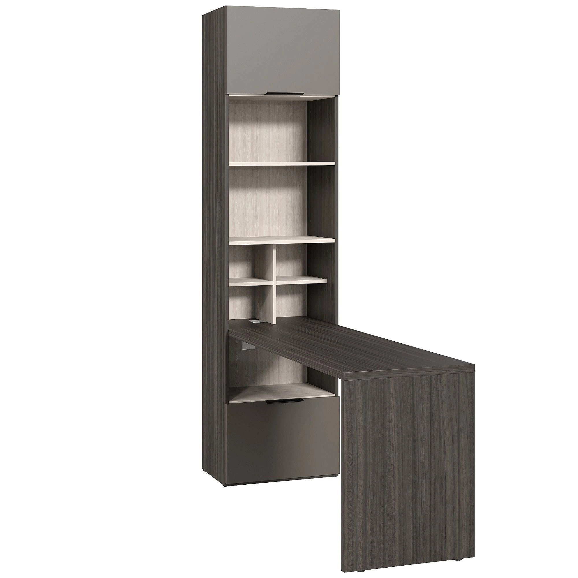 Организуйте комфортное рабочее пространство вместе с коллекцией Soho графит – удобный и надежный стол со стеллажом помогут справиться с этой задачей. Лаконичные линии, трендовое сочетание глубокого серого цвета с темным древесным декором, минималистичный образ – прекрасное дополнение к интерьеру кабинета, спальни или гостиной. В закрытых секциях можно хранить документы и запас канцелярии, а на открытых полках стеллажа – профессиональную или учебную литературу и акцентный декор. Столешница толщиной 32 мм достаточно широкая для комфортной работы за компьютером или ноутбуком. А специальный слот для кабель-канала поможет удобно организовать подключение техники. Модуль идеально сочетается с выкатной тумбой и другими секциями из коллекции Soho, может использоваться как в составе полноценных мебельных композиций, так и самостоятельно.