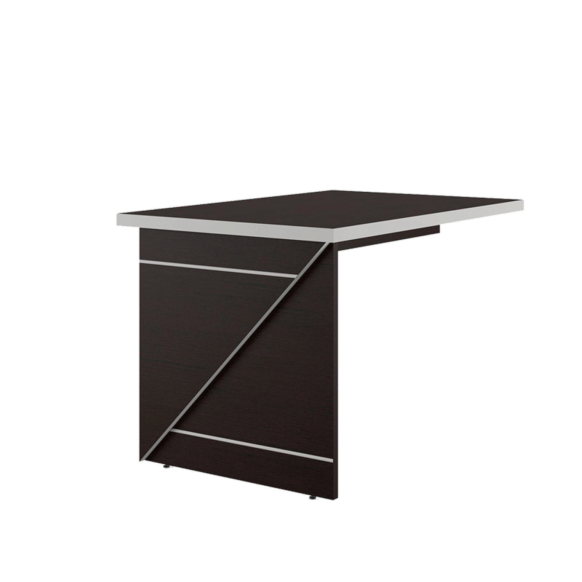 Габаритные размеры (мм) 1200х800х780. Брифинг состоит из столешницы, вертикального щита (опоры) и царги. Столешница двухслойная из ЛДСП 18мм, суммарной толщиной 36мм, торцы облицованы кромкой 2мм – 3D-акрил под металл. Вертикальный щит (опора) представляет собой декоративный элемент двухслойный из ЛДСП 18мм, суммарной толщиной 36мм, стилистически повторяя конфигурацию передней панели стола, видимые торцы облицованы кромкой ПВХ 2 мм. Опора декорирована хромированными горизонтальными молдингами. Царга из ЛДСП 18мм, видимые торцы облицованы кромкой ПВХ 0,4мм. Сборка осуществляется с использованием эксцентриковых стяжек. Опоры регулируются по высоте. Укомплектован двумя стяжными пластинами и винтами для их крепления