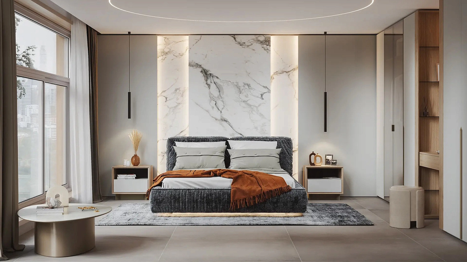 - Делаем открытые решения, с фасадами/дверями (распашные или купе) и смешанные. В спальне чаще выбирают двери — меньше пыли и выше акустический комфорт.
