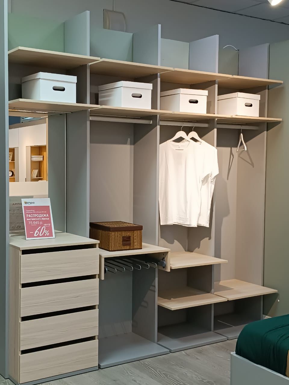 в двухдверном модуле установлены штанга , две полки и комплект из двух ящиков;